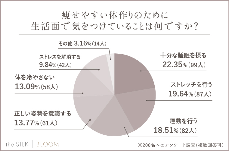 この記事では、痩せやすい体を目指すための食事法や生活習慣、筋肉作りのポイントを、女性200名の調査結果とあわせて紹介します。
