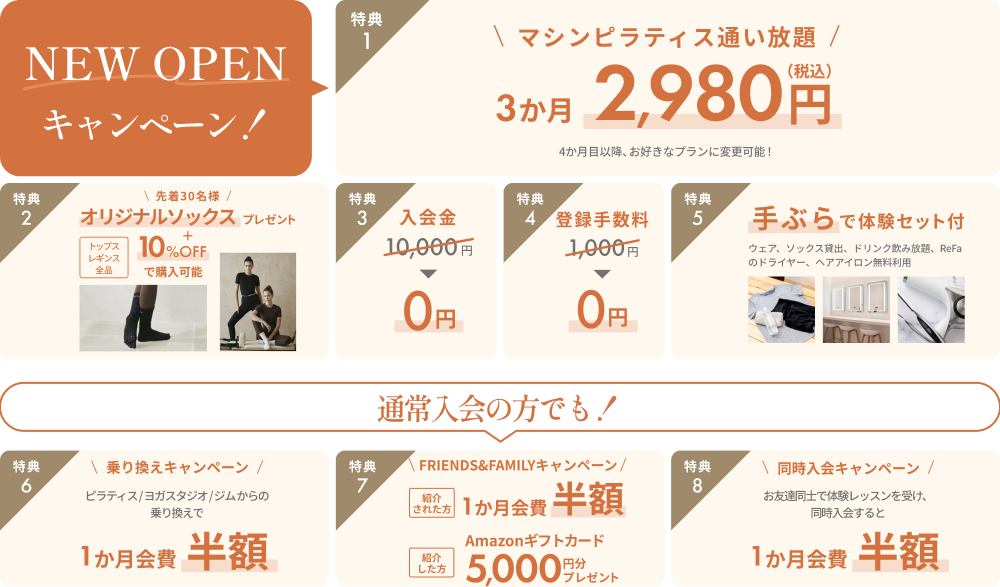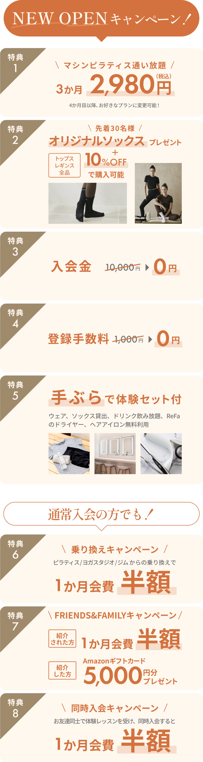 ※初めてthe SILKをご利用される方限定。 ※3ヶ月間の契約継続がキャンペーン適用条件となります。 ※キャンペーン対象レッスンは、グループレッスンのみになります。パーソナルレッスンは本キャンペーンの対象外。 ※在籍確認の為、ご利用中のヨガ・ピラティス・フィットネスクラブ・ジムの会員証をご持参ください。 ※退会されておらず、ヨガ・ピラティス・フィットネスクラブ・ジムに通われている場合も対象となります。 ※退会後(前スタジオの)、半年以内であれば適用可能です。 ※3ヶ月に満たないで解約される場合は、通われた月の通常料金は有償となります。 ※2ヶ月目から通常料金をお支払いいただきます。 ※4ヶ月目よりプラン変更が可能です。 ※割引期間中は登録店舗のみご利用いただけます。 ※体験当日にご入会手続きとマンスリー契約をされた場合に限ります。 ※入会キャンペーン1~4との併用が可能です。
